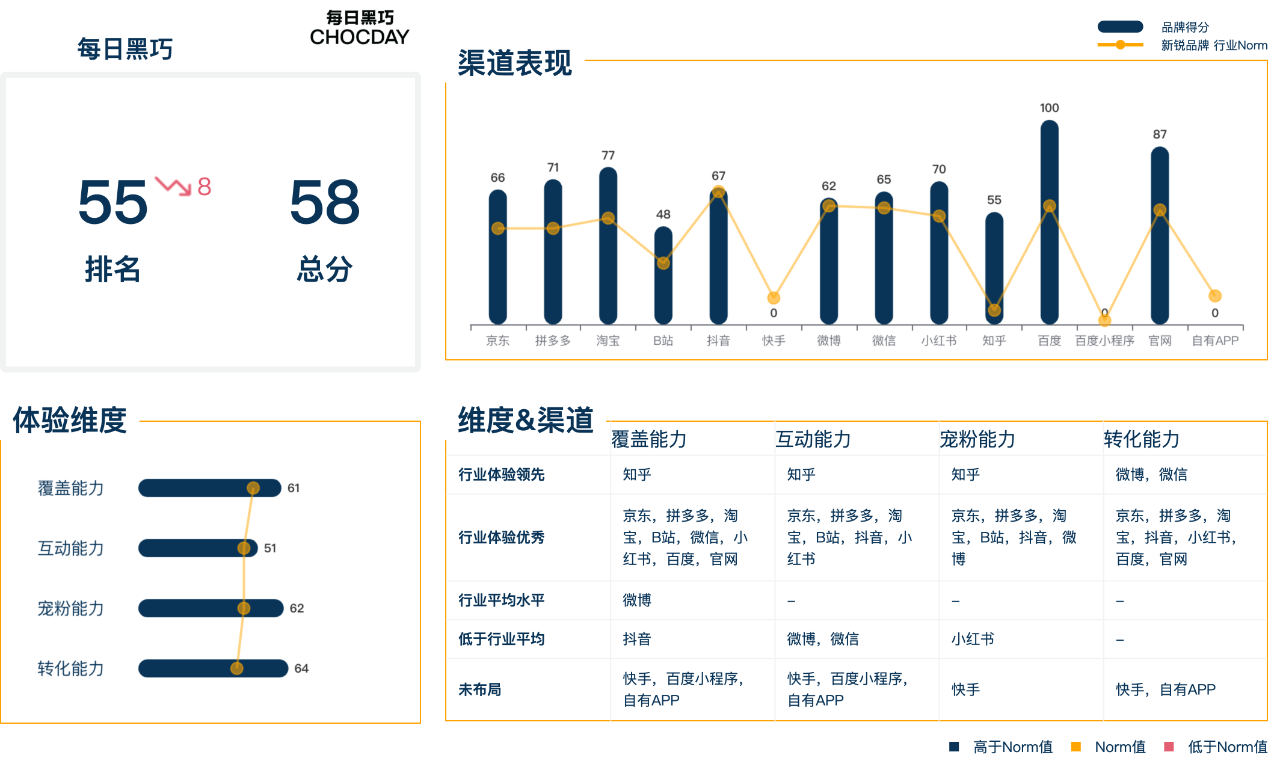 据新锶体验数据监测,每日黑巧品牌数字化体验得分58分,在新锐行业中排名第55位。与上一期监测结果相比,本期排名出现了8名的下滑。