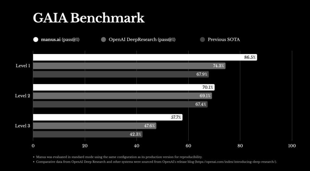 Manus在GAIA基准测试上的得分高于OpenAI Deep Research和此前的SOTA模型(指在该项研究任务中最好的模型)。来源:Manus