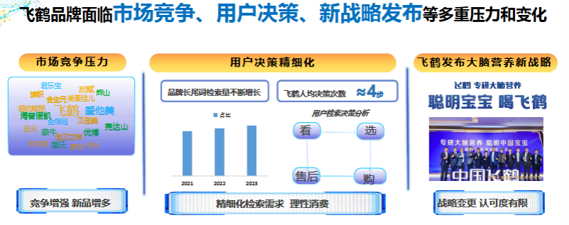 飞鹤发布大脑营养新战略,旨在强化在母婴市场的竞争力。然而,市场竞争激烈,新品不断涌现,用户决策过程变得更加精细化。在选购奶粉时,母婴人群会进行大量长尾词搜索,获取品牌资讯、口碑、产地、产品对比等信息,但市场信息繁杂,用户在探寻品牌信息的路径中容易受到干扰而流失。同时,AI 技术的兴起为营销创新带来了新机遇,百度作为 AI 营销先行示范区,拥有强大的技术生态和搜索核心生态,为飞鹤的营销变革提供了有力支撑。