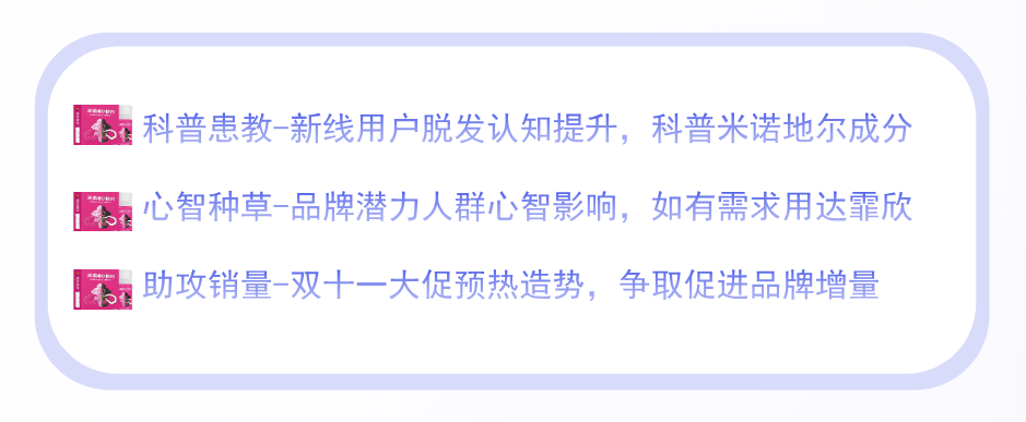 - 心智种草:影响品牌潜力人群的心智,在消费者心中建立 “如有脱发需求就用达霏欣” 的认知。