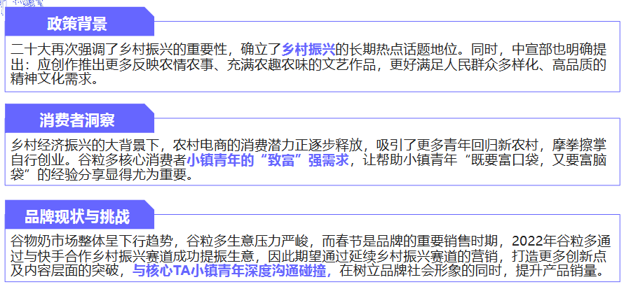 - 政策背景:二十大强调乡村振兴的重要性,中宣部倡导创作反映农情农事的文艺作品,乡村振兴成为长期热点话题,为谷粒多开展相关营销活动提供了政策支持与社会关注基础。