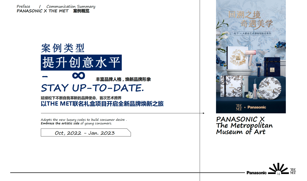 松下美容作为美容个护市场的知名品牌,一直致力于通过创新的营销手段提升品牌在年轻消费者中的影响力。2023 年底,松下与纽约大都会艺术博物馆联名推出 “回溯之境,奇遇美学” 营销活动,旨在通过艺术联名丰富品牌人格,焕新品牌形象,实现联名礼盒破圈,放大品牌声量,进一步提升其在美容个护市场的竞争力。