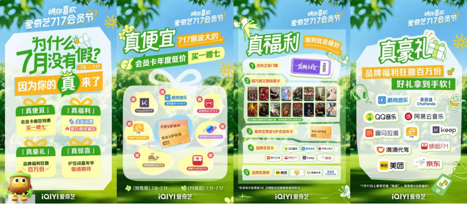 爱奇艺表示,本届会员节延续了首届“桃你喜欢”的主题,旨在通过一系列福利回馈会员。除了核心的影音会员权益和抽奖,平台还携手京东、美团、网易严选、QQ音乐、网易云音乐、茶百道等众多生活服务品牌,共同发放超百万份涵盖购物、音乐、出行等多场景的品牌福利。正在进行的“会员最期待IP”投票活动也为会员日增添了互动趣味性,备受会员喜爱的“IP互动嘉年华”也将后续上线。