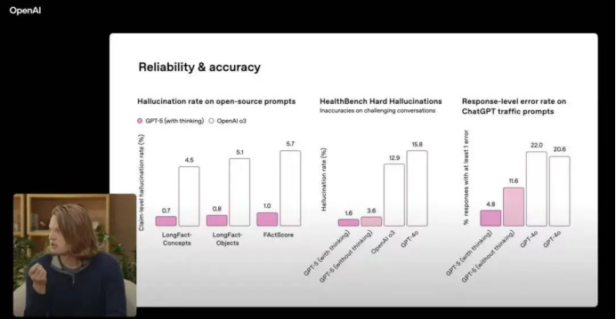 "AI幻觉"一直是大型语言模型最受诟病的问题之一,而GPT-5在这方面实现了重大突破。OpenAI官方数据显示,GPT-5在联网搜索时出现事实错误的概率比GPT-4o低了45%;在自主推理时错误率比OpenAI o3模型低80%。