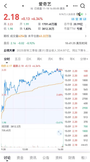 业绩报告发布后,当天美股开盘股价即拉升5%,盘中一度最高上涨超8%,最终收盘时报2.18元,上涨6.34%。