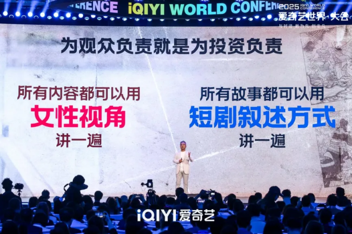“2025年内容行业唯一一个关键词就是‘短’——微短剧时长短、长剧集数短、电影占用时间短。”王晓晖指出,2025年将开启为期两年的“长+短”内容变革周期,微剧进入“速度决胜期”,短剧开启“爆款破局期”,长剧进入“阵痛转型期”,电影迈入“创新涅槃期”。在此背景下,他表示,爱奇艺将以“长+短”内容并行、解构与建构结合、量产与质产并举的策略指导内容创作与生产,通过长短协同开发、多元剧场运营、工业化生产体系升级等措施,实现内容价值的最大化释放。