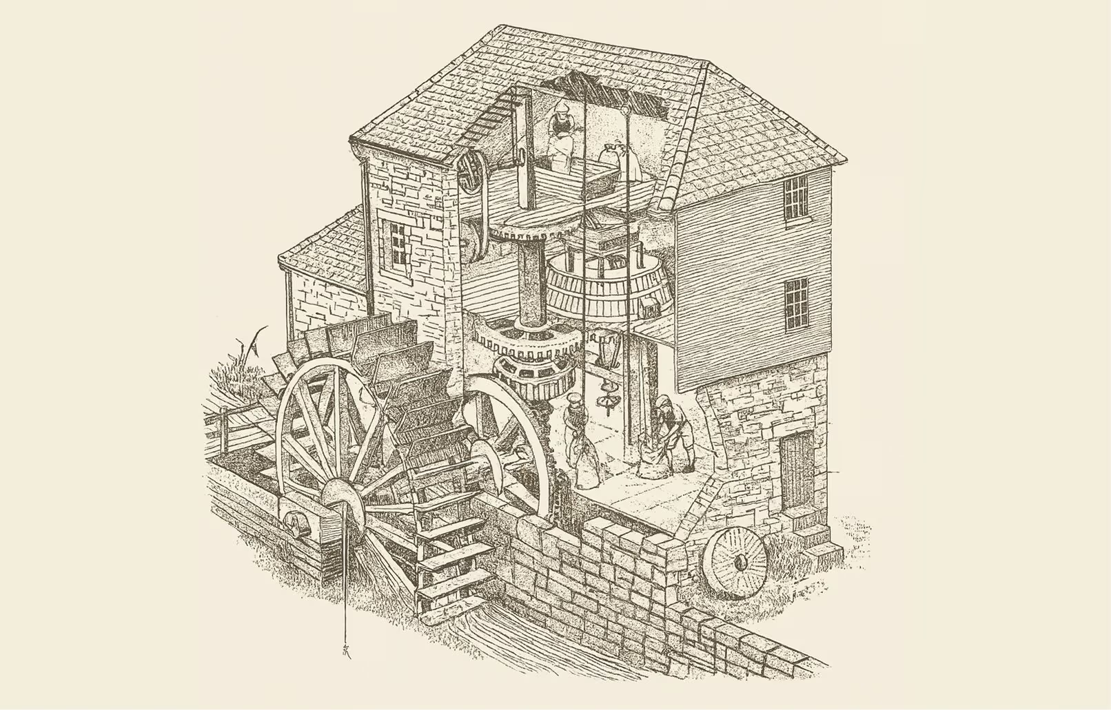 (用水车驱动运转的磨坊。水有力量,但不稳定,而且把工厂锁定在少数地点并受季节制约。)