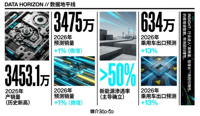 2. 行业增速进入“微增调整期”:2025年汽车产销3453.1万辆、3440万辆(创历史新高);2026年呈“高销量、低增长”特征,中汽协预计3475万辆(+1%),车百会预计2800万辆(+2%),市场回归理性。