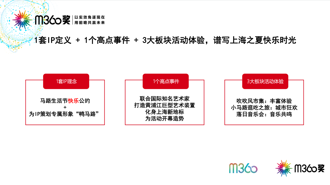 【关键动作】 提炼“鸭马路”视觉符号并叠加黄浦江巨物营销高点,串联市集、音乐会与多线街区漫游,构建全景式沉浸互动。