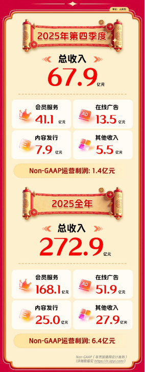 2月26日,爱奇艺(NASDAQ:IQ)发布截至2025年12月31日未经审计的第四季度及全年财报。全年总收入272.9亿元人民币,Non-GAAP(非美国通用会计准则)运营利润6.4亿元,连续四年运营盈利。其中,第四季度爱奇艺总收入67.9亿元,实现同环比双增长。Non-GAAP运营利润为1.4亿元。