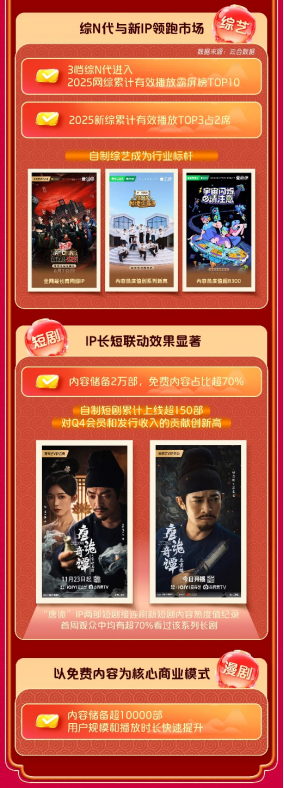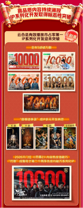 内容是爱奇艺发展的基石。长剧集方面,第四季度优质内容持续涌现,爱奇艺稳居云合剧集总有效播放市占率第一,IP系列化开发迎来突破。《唐朝诡事录》成为首个连续两季作品内容热度值破万的IP,《唐朝诡事录之长安》在2025年新上线剧集中广告收入表现第一,会员收入表现第二。短剧《唐诡奇谭之长安县尉》和《唐诡奇谭之九重楼》接连刷新短剧内容热度值记录。两部短剧首周观众中,均有超70%看过该系列长剧,显示多样化的内容形态有效延展了IP生命周期。2026开年,警匪刑侦剧《罚罪2》内容热度值破万,“罚罪”成为爱奇艺第二个两季内容热度值均破万的系列化IP。