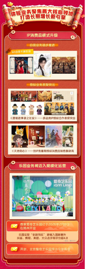第四季度,IP消费品自营业务稳步推进,《赴山海》等卡牌热销。在IP 授权业务上,《唐朝诡事录之长安》在食品饮料、美妆、潮玩等多品类合作中表现突出;《天地剑心》创下热播期IP授权消费品销售额新高。2026年,爱奇艺在巩固授权业务的同时,将重点拓展自营IP消费品业务,把卡牌业务的成功经验复制到谷子、潮玩等更多品类。