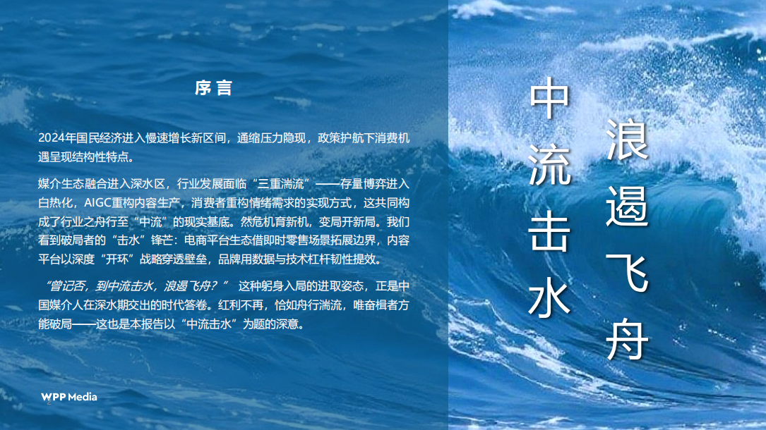 当我们把《2025中国媒介概览:中流击水》置于全球商业的长周期坐标系中,它早已超越一份媒介投放指南的边界,成为一部经济换挡期下,社会资源、注意力资本与消费者心智重构的战略史诗。为了真正刺透这份报告的商业内核,我们并非做简单的信息拆解,而是以全球顶级商业分析范式完成全文重构:以《经济学人》的长周期宏观穿透力锚定经济换挡的底层逻辑,以《连线》的技术范式革命视野拆解数字基建的底层重构,以《快公司》的商业创新敏锐度挖掘情绪资本的变现模型,以《福布斯》的全球资本嗅觉重估媒介的资产价值,最终以麦肯锡/BCG等顶级咨询的MECE战略框架,把行业数据转化为可落地、可测算、可复盘的企业决策指令。