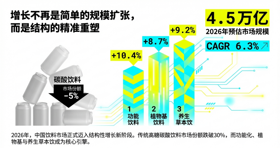 2026 年,中国饮料市场预计突破 4.5 万亿元,增长从规模扩张切换为结构性增长:功能饮料、植物基、养生草本成为三大引擎,而高糖碳酸继续下行。真正的赢家,不只更会做产品,而是能把“健康可信、供应链韧性、渠道效率、绿色合规”打包成消费者可感知的确定性。