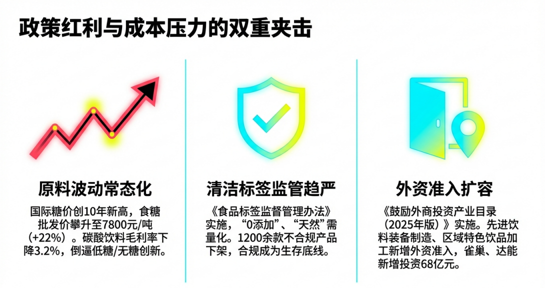 事实:糖与关键原料价格波动在 2025 年对行业毛利形成压力,企业出现提价、配方调整与甜味剂替代,同时推动低糖/无糖结构加速。关键数据:2025 年上半年,碳酸饮料企业平均毛利率同比下降 3.2 个百分点;头部企业通过提价转嫁成本,农夫山泉、可口可乐等核心产品终端价上涨 5%-8%;低糖 / 无糖饮料销售额占比同比提升 7 个百分点至 45%。