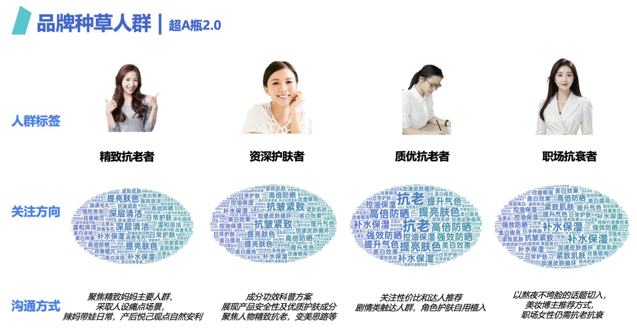 1. 产品痛点各异,需定制化打法:超A瓶抗老的核心问题是曝光不足、人群狭窄,抗老心智联想量低;胶原水光面膜则是曝光够但触达不准,紧致心智联想量低,两大产品痛点截然相反,无法采用统一营销打法,对定制化、差异化策略提出高要求。