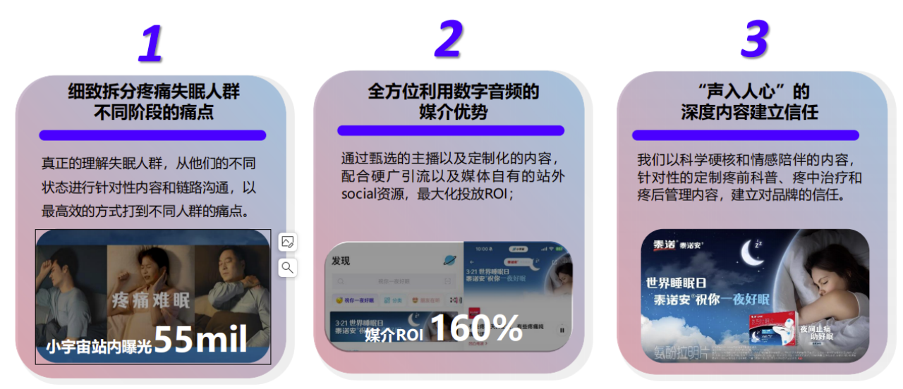 2. 媒介层面:验证播客作为疼痛失眠场景营销载体的有效性,实现高效投放ROI,探索健康品类与有声媒体融合的营销路径。
