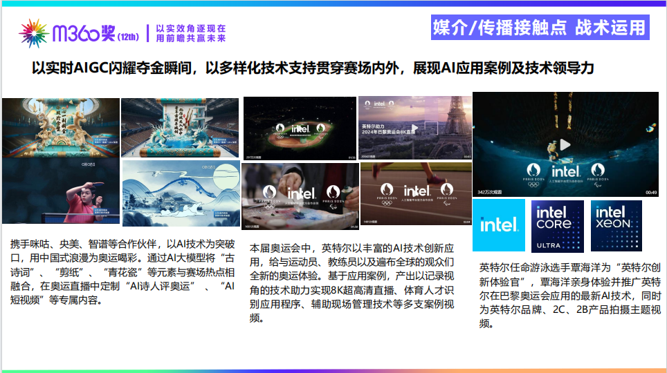 在全球顶级体育赛事的营销竞技场中,B2B科技巨头往往面临着“技术隐形”与“大众共鸣缺失”的双重困境。在2024年巴黎奥运会期间,英特尔中国以“一起AI在奥运”为主题,跳出了传统赞助商“贴标式”的营销窠臼。本报告基于全球顶级智库分析师视角,对该M360内容创新奖金奖案例进行深度结构化解构。该案通过AIGC技术的实时介入与本土文化的深度融合,成功将底层算力转化为前端的视觉震撼与情绪共鸣,为硬核科技品牌的本土化、敏捷化、场景化营销提供了极具指导意义的战略范式。