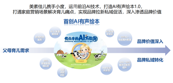 2024年8月-2025年2月,美素佳儿针对20-40岁拥有0-3岁宝宝的家庭,联合小度与盛世长城,升级推出「声动绘本·宝宝AI牧场奇旅」2.0营销活动。活动在1.0 AI有声绘本基础上,新增AI生图、AI作曲、陪伴式IP对话三大核心功能,通过“上传宝宝照片生成卡通角色+克隆父母音色朗读+原创牧场主题故事”的沉浸式互动,联动全域传播与私域引流,实现高量级家庭触达与深度参与,成功强化品牌“科学育儿+情感陪伴”的核心心智,完成品牌资产与私域用户的双重沉淀。