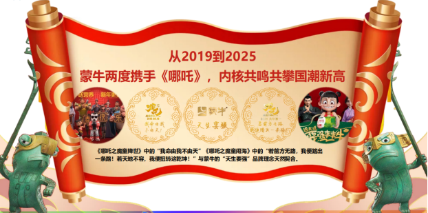 国漫IP已成为品牌年轻化破圈的核心载体,但IP联名市场竞争激烈,多数品牌陷入“流量嫁接”的浅层合作困境。蒙牛作为国民乳制品品牌,继《哪吒之魔童降世》后,再次携手续作《哪吒之魔童闹海》,以“天生要强”与“我命由我不由天”的精神内核共鸣为核心,创新打造“内容共创+全域饱和传播+产品深度融合”的全链路营销,成功从十余个合作品牌中脱颖而出,不仅带动春节期间销量大幅增长,更强化了品牌年轻化形象,为IP联名营销树立了标杆范式。