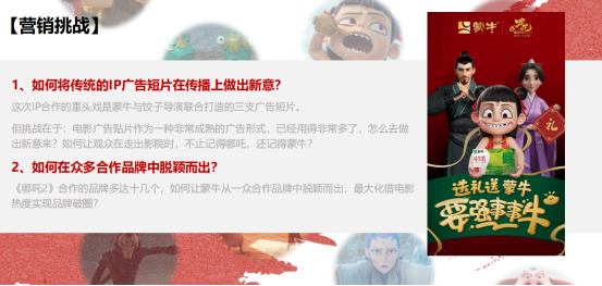 蒙牛作为国民乳制品品牌,以“天生要强”为核心品牌理念,2019年与《哪吒之魔童降世》的合作已积累良好的用户基础。2025年《哪吒2》上映,其“若前方无路,我便踏出一条路”的精神内核与蒙牛理念高度契合,蒙牛顺势开启二次合作,获得长达1年的卡通授权、饺子导演操刀专属TVC、全产品线包装焕新等重磅权益。但面临三大核心挑战:一是如何从众多联名品牌中脱颖而出;二是如何让传统广告短片做出新意,避免用户审美疲劳;三是如何将IP流量转化为品牌长期价值与实际销量。