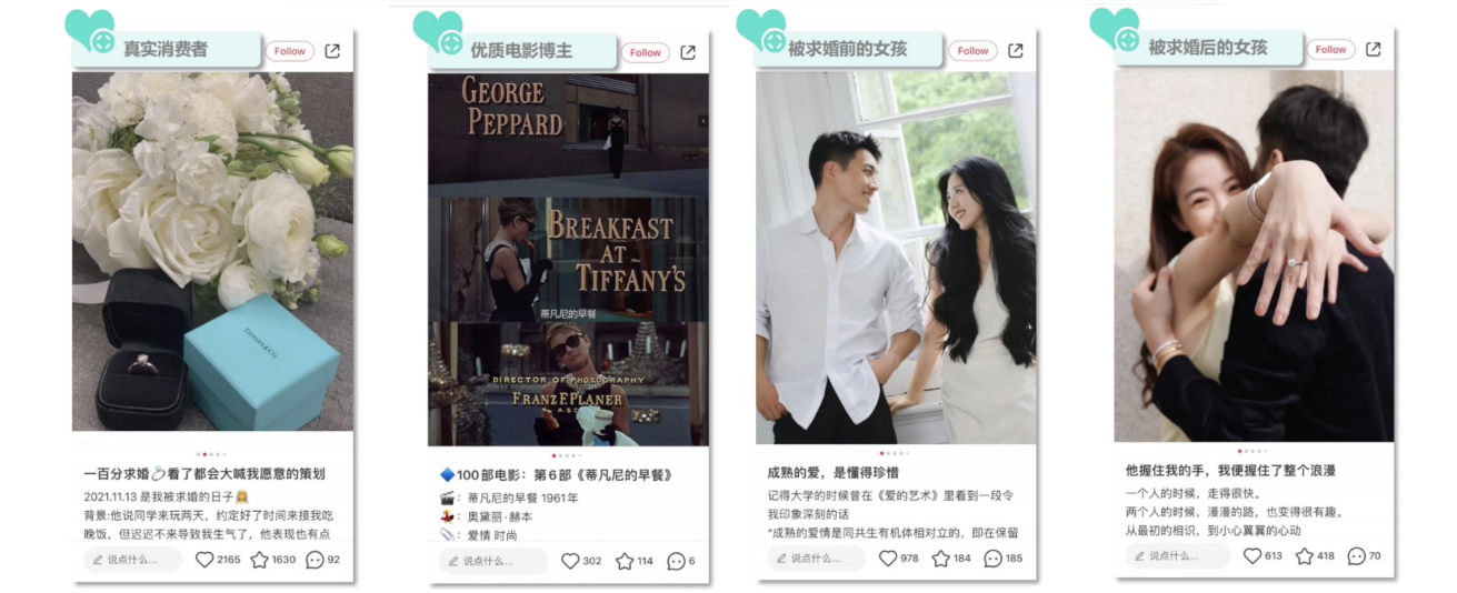 激发用户内容共创热情:鼓励用户分享与 Tiffany 相关的求婚瞬间,积累大量优质 UGC 内容,形成品牌传播的裂变效应,进一步强化品牌的求婚珠宝标签。