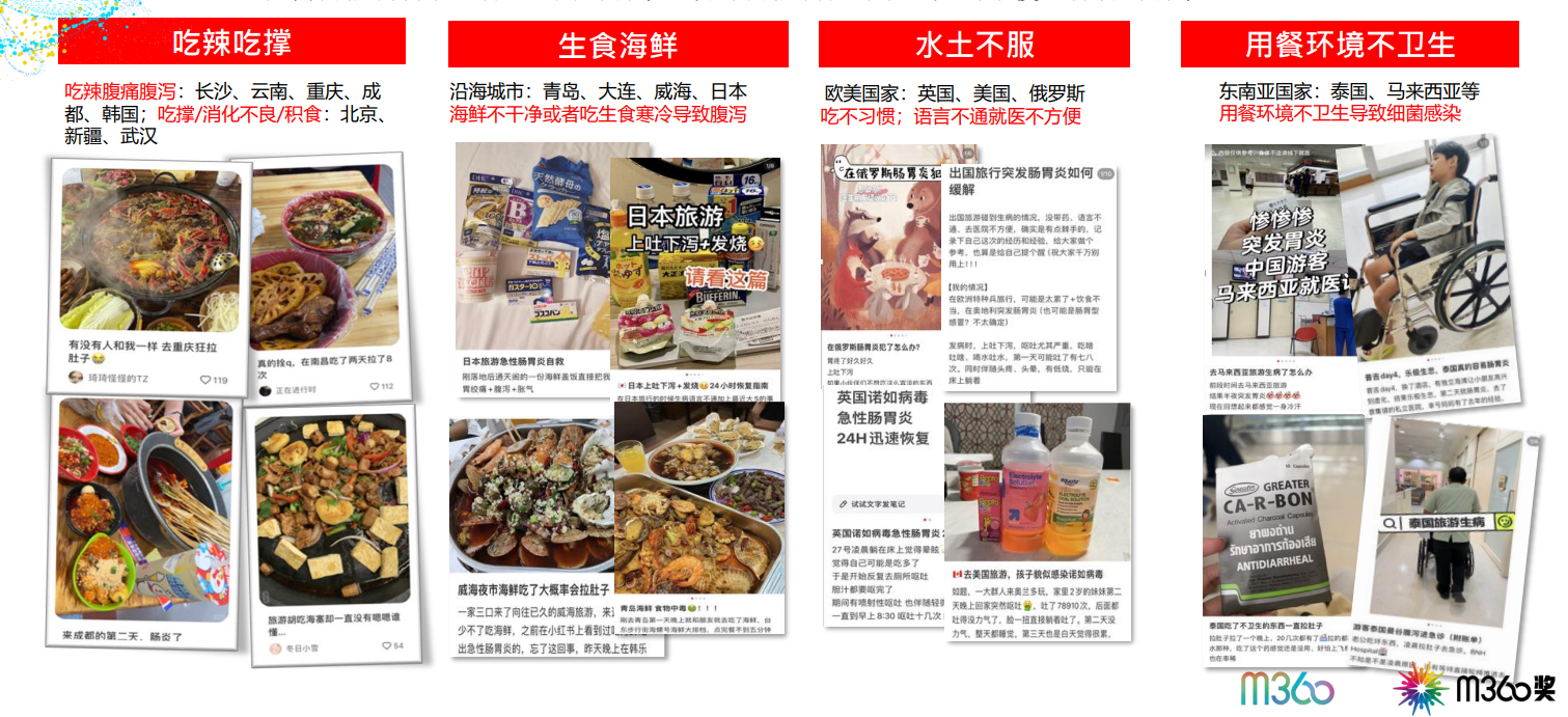 场景心智占领难:肠胃用药赛道竞品众多,藿香正气水、蒙脱石散等品牌搜索声量领先,如何在旅游场景中差异化突围,建立专属心智。