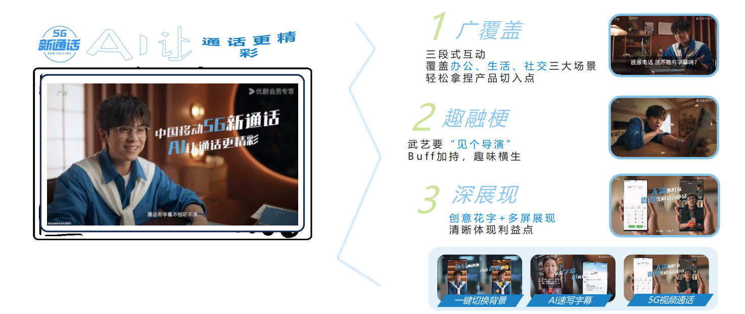 中国移动作为通信行业头部品牌,拥有领先的 5G 技术与多元的业务布局,亟需将 5G 技术的应用价值具象化、场景化,打破大众对 5G 技术的认知壁垒;优酷作为长视频平台,拥有优质的综艺 IP 资源与自研营销 IP 体系,具备内容制作、流量运营与线下落地的全链路能力,双方的资源互补为深度合作奠定了基础。