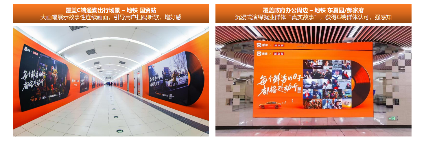 关键动作:打造《一路同行》真实故事 MV 为内容核心,借助权威媒体背书与明星号召力实现全国线上扩散,聚焦北京打造 “地铁创意包站 + 户外大牌 + 巡游巴士” 的线下沉浸式场景,通过扫码听歌实现线上线下互动闭环。