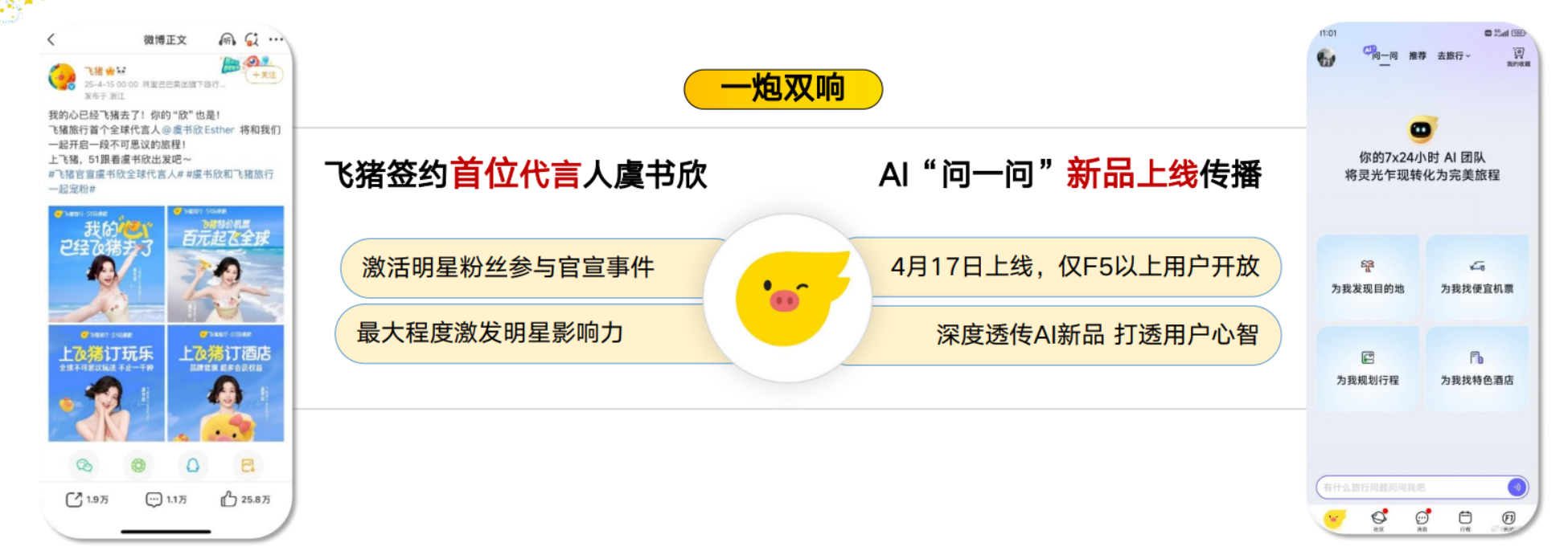 飞猪作为头部旅行平台,面临产品功能同质化与年轻用户需求升级的双重挑战,亟需找到破局关键:一方面,计划官宣首位全球代言人虞书欣,如何激活明星粉丝势能,将粉丝热度转化为品牌关注度与用户增长;另一方面,即将上线 AI 旅程规划产品 “问一问”,需在短期内快速推广新品,让 “AI 规划旅行” 的核心心智扎根用户认知,形成与竞品的差异化壁垒。基于此,飞猪决定以 “明星 + AI” 双引擎联动,同步实现品牌年轻化转型与技术创新落地。