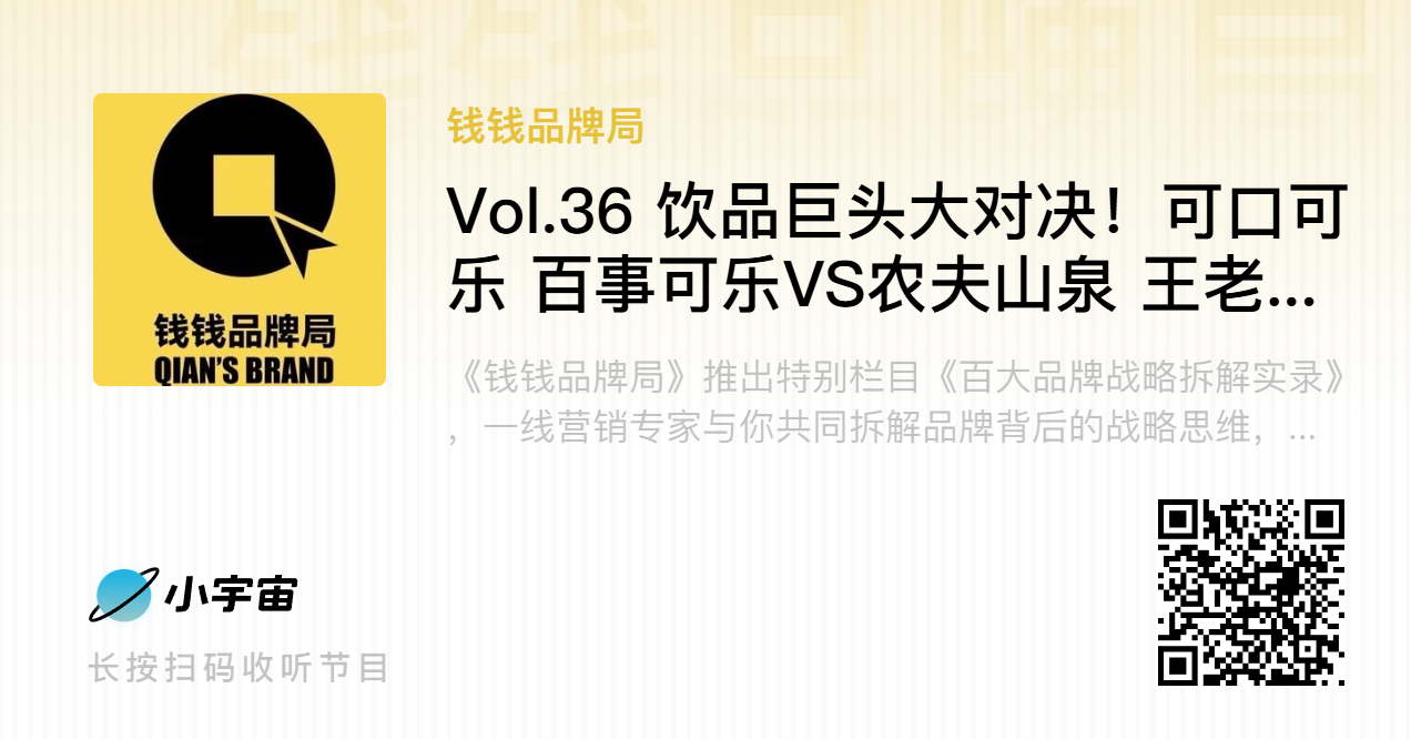 在饮料市场竞争白热化、品类创新与消费需求迭代并行的背景下,头部品牌的战略布局与营销打法成为行业增长的重要参考。《钱钱品牌局》推出特别栏目《百大品牌战略拆解实录》,邀请一线营销专家共同拆解全球顶尖品牌的战略思维,深入剖析成功要素与赛道对决逻辑,通过真实案例提炼品牌持续增长方法论,助力品牌成为商业增长的强大引擎。本期聚焦四大饮料巨头 —— 可口可乐、百事可乐、农夫山泉、王老吉,解锁碳酸与非碳酸赛道的竞争核心与用户心智占领之道。