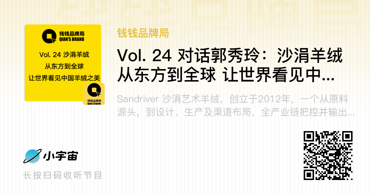 本期【钱钱品牌局】播客特邀Sandriver 沙涓艺术羊绒品牌创始人郭秀玲做客分享,围绕品牌创立、行业发展以及个人成长三大核心话题,深度拆解其深耕羊绒行业的匠心坚守与前沿见解。创立于 2012 年的 Sandriver 沙涓,是从原料源头到设计、生产及渠道布局全产业链把控的高品质羊绒品牌,被管理大师 Hermann Simon 教授誉为中国品牌的 “隐形冠军”,更成为全球商学院经典传播案例。品牌连续八年受邀参加巴黎时装周、三年亮相 Maison&Object 巴黎时尚家居设计展,是唯一入驻 LVMH 旗下巴黎顶级百货 Le Bon Marché 的中国品牌,亦与安缦、瑰丽等顶级奢华酒店达成全球合作。郭秀玲以羊绒为笔、以匠心为墨,在时光中勾勒出关于美、爱、传承与创新的品牌图景,为中国品牌的全球化发展提供了珍贵范本。