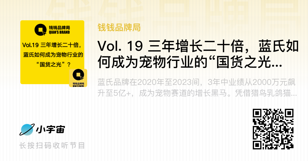 本期【钱钱品牌局】特邀蓝氏品牌市场总监付乐深度分享实战经验。蓝氏品牌在 2020—2023 三年间,业绩从 2000 万元飙升至 5 亿 +,成为宠物赛道现象级增长黑马;凭借猎鸟乳鸽猫粮等爆款创新产品,蓝氏快速占领市场,从老牌狗粮品牌成长为头部宠物品牌。