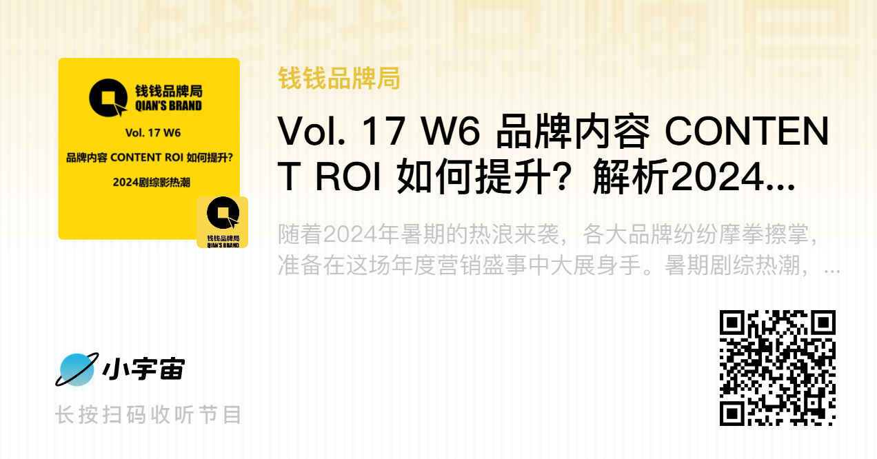 本期【钱钱品牌局】品牌热点风向标周报聚焦2024 暑期内容营销新风向核心主题。随着 2024 年暑期热浪来袭,各大品牌纷纷摩拳擦掌,全力布局这场年度营销盛事。暑期剧综热潮作为一年中最受瞩目的娱乐盛宴,无疑成为品牌营销的必争之地,但在这场内容营销狂欢中,ROI(投资回报率)已然成为品牌不得不面对的核心必答题。本期主理人钱钱携手联合主播、品牌实战派专家 JASMINE 杨志华,MSAI 营销科学家 Phil,M360 - MSAI 智库副总吴康军,共探 2024 内容营销新风向,拆解剧综营销的核心逻辑与高 ROI 打法。