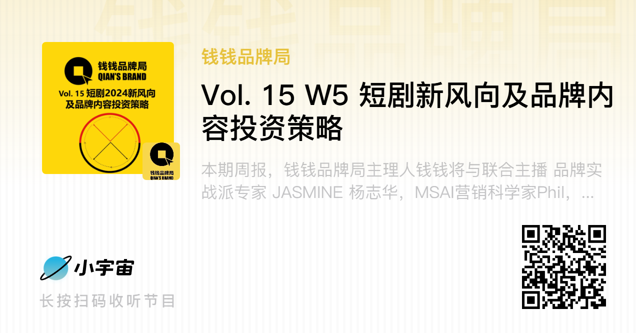 本期【钱钱品牌局】品牌热点风向标周报聚焦短剧营销新风向核心主题,主理人钱钱携手联合主播、品牌实战派专家JASMINE 杨志华,MSAI营销科学家Phil,M360 - MSAI 智库副总吴康军及分析师向向,共同探讨短剧市场的发展机遇与趋势,拆解品牌在短剧领域的内容投资策略,助力品牌抓住短剧风口,实现营销突围。