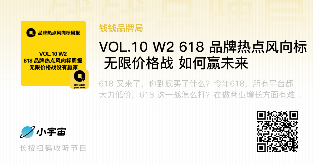 618如约而至,各大平台全力加码低价策略,这场全民消费盛宴背后,品牌面临着激烈的市场博弈。618这一战该怎么打?在商业增长方面,品牌有哪些难点、痛点、伤点?又有哪些喜点、快点值得关注?本期【钱钱品牌局-品牌热点风向标周报】,邀请实战派专家杨志华、莫向晖,智库执行主编吴康军、高级分析师向向,共同探讨618无限价格战的核心逻辑,拆解行业困局与突围路径,探寻真正的赢家密码。