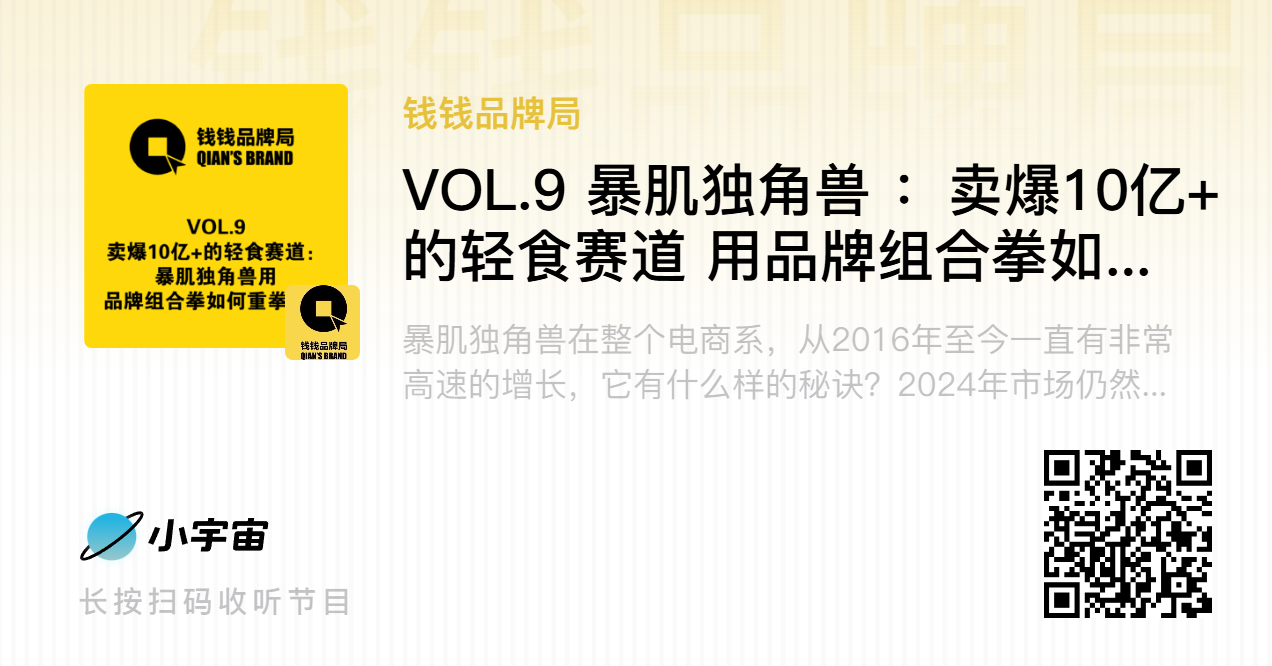 暴肌独角兽自2016年以来,在电商体系中保持高速增长,其背后的增长秘诀是什么?2024年市场环境依然严峻,消费降级背景下,暴肌独角兽如何把握健康食品产业机遇,洞察消费者买点,用品牌组合拳打造产品卖点、孵化爆款?本期【钱钱品牌局】,特邀暴肌独角兽联合创始人吴昌盛,分享品牌发展经验,解读新消费品牌如何在2024年的趋势浪潮中顽强活下去,捕捉更多增长机会。