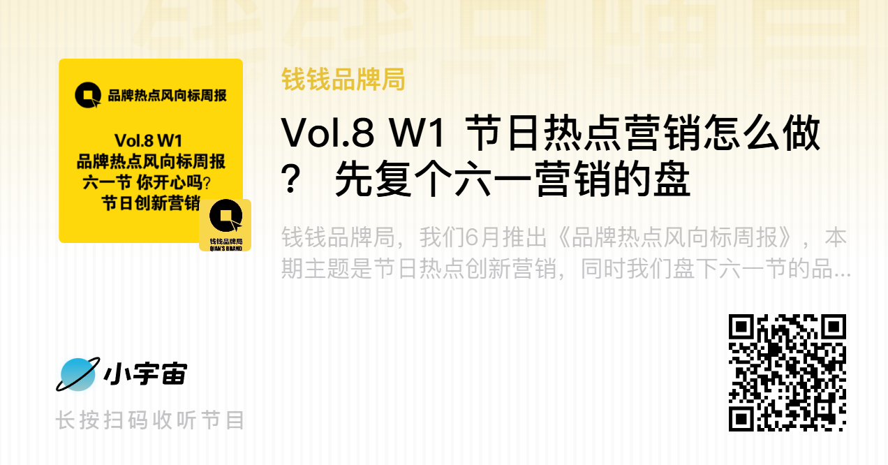 【钱钱品牌局】6月正式推出《品牌热点风向标周报》,本期主题聚焦节日热点创新营销,同步盘点刚刚过去的六一儿童节品牌营销案例。六一儿童节历来是品牌营销的高点与热点,M360智库特出品《六一节营销报告》,复盘节日营销亮点。今年六一,麦当劳、宝马、王老吉、奥利奥等诸多品牌纷纷下场参与,让六一节不再局限于儿童,成为“大家的六一”。品牌通过多元创新方式,既激发儿童兴趣,又推动儿童节泛人群化,本期周报,嘉宾团将共同解读其中的营销密钥,为后续节日营销提供借鉴。