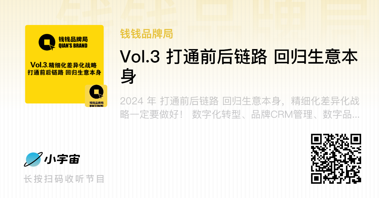 2024年,品牌发展的核心关键词的是“打通前后链路、回归生意本身”,精细化、差异化战略成为品牌破局的关键!当下,数字化转型、品牌CRM管理、数字品牌资产管理、营销科学与艺术,已然成为各大品牌数字化战略地图上的关键要塞。随着品牌经营环境与营销生态越来越复杂,奢侈品行业、酒类品牌轩尼诗,仅用短短数月就建立起自身的数字自动化系统,上线专属CRM系统与小程序,实现高效数字化布局。本期【钱钱品牌局】邀请到轩尼诗数字化、CRM、媒介负责人杨燕,分享轩尼诗如何高效打造品牌CRM系统,如何以精细化、差异化服务尊重客户,如何打通前后链路,最终回归生意本身,为品牌降本增效、实现实效增长提供实战借鉴。