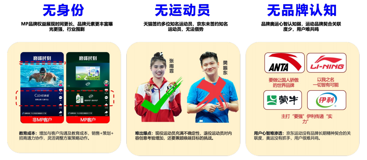 先天资源匮乏,难以借势运动员流量:京东运动未签约任何知名奥运运动员,与签约多位顶尖运动员的竞品形成鲜明差距,无法通过运动员个人 IP 实现品牌曝光与用户共鸣,奥运营销缺乏核心抓手。