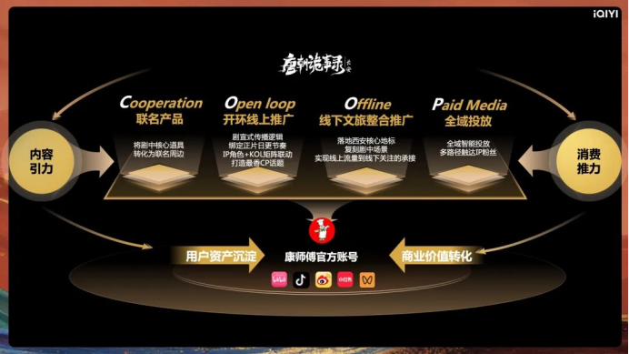 深度共创的终极目标是实现可衡量、可沉淀的商业回报,让“火”起来的流量变成品牌留得住的“销量”。爱奇艺将康师傅案例的成功实践,系统化地提炼为可复制、可迭代的 “COOP全域增长模式”。该模式以Cooperation-Open Loop-Offline-Paid Media四大模块构成闭环,旨在系统性地将IP的情感价值,转化为品牌可持有、可运营、可增值的长效资产。