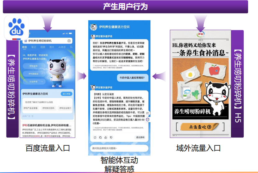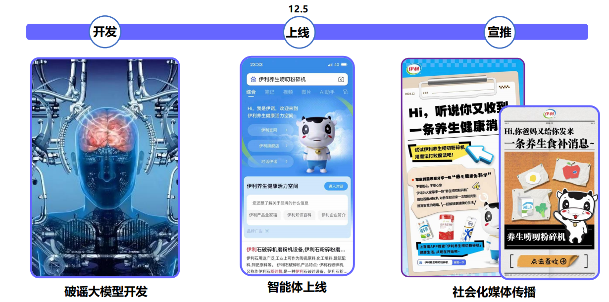 伊利联合百度依托大模型 AI 能力,打造 “养生唠叨粉碎机” AI 智能体 “伊诺”,针对大众对牛奶的养生谣言进行精准识别、科学辟谣、趣味科普,通过 H5 互动、社交传播、家庭场景渗透,重建消费者对牛奶的正确认知,缓解代际数字鸿沟,实现品牌权威信任提升、品类认知纠偏、消费信心提振,为快消行业提供科技赋能品牌公关的可复制范本。