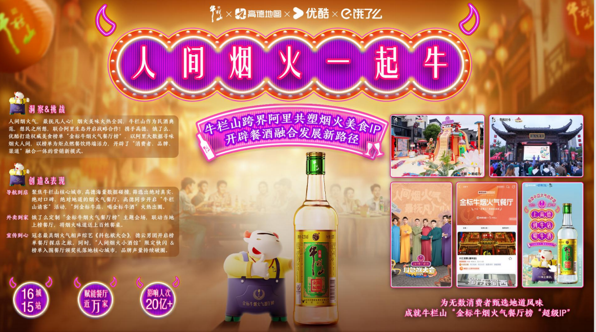 牛栏山以 “金标牛烟火气餐厅榜” IP 为核心,联动阿里生态优酷、高德、饿了么三大平台,面向全国饮酒人群与年轻消费群体,通过榜单升级、内容升级、宣发升级,构建 “到店 + 到家 + 到心” 餐酒融合闭环,冠名《抖包袱大会 2》、落地 9 城超级打卡、赋能 4500 家餐厅,实现全网近 20 亿曝光,成功将烟火市井文化与国民民酒深度绑定,开辟成熟白酒品牌长效增长新路径。