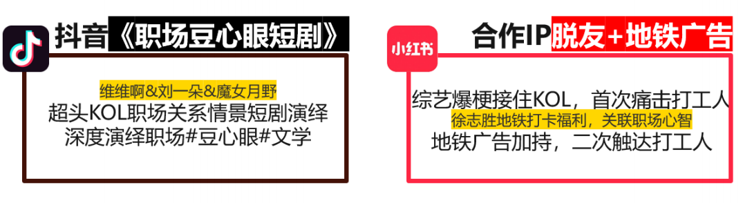 关键动作:打造「职场豆心眼短剧」矩阵,联动徐志胜地铁事件引爆舆论,小红书 + 抖音双平台精准种草,线下脱口秀专场收口。