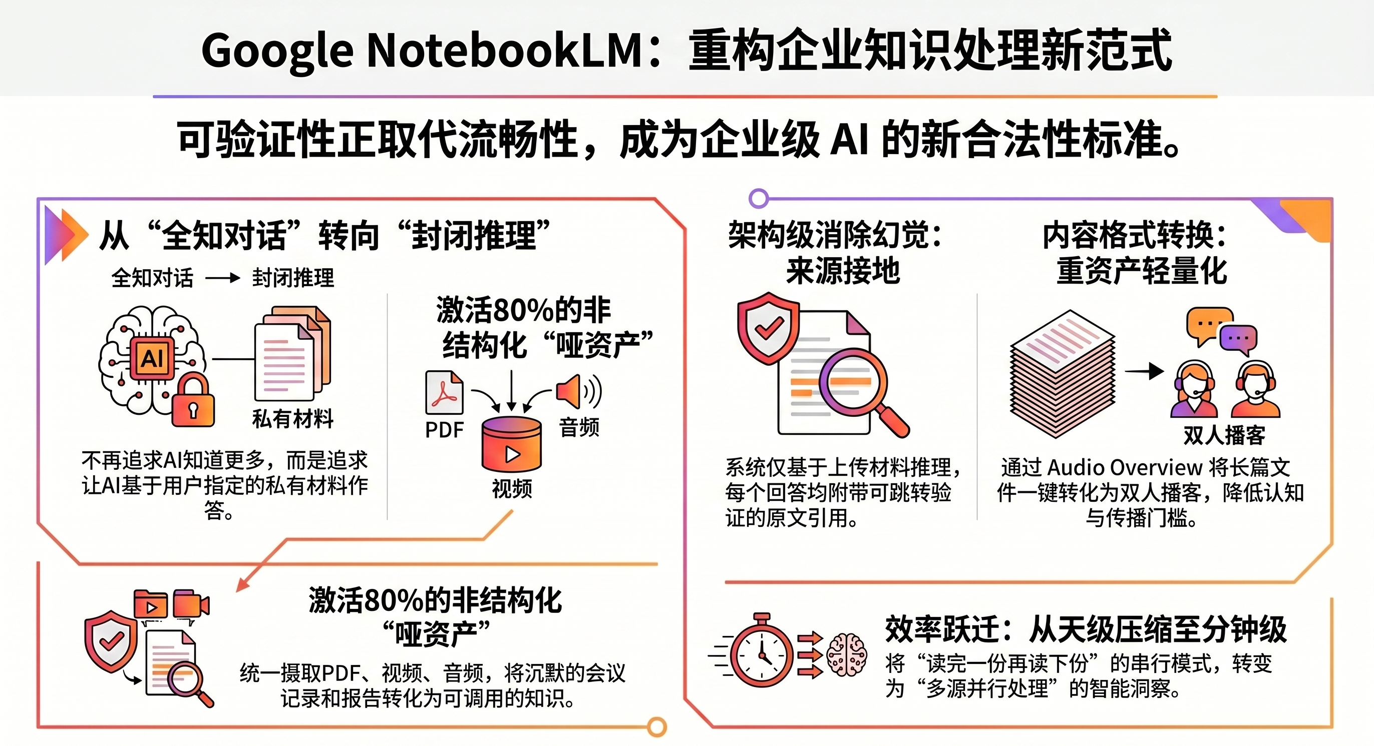 本文分析 Google NotebookLM 作为“私有知识工作空间”品类的结构性创新。核心判断NotebookLM 的真正价值不在生成能力,而在以来源封闭性换取输出可验证性,这一设计重新定义了企业 AI 的合法性标准。读者将获得一套识别、评估、落地此类工具的完整分析框架。