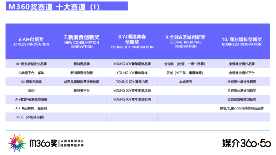 本届M360奖设置十大赛道,全面覆盖营销创新、媒介创新、内容创新、电商增长创新、品牌科技创新、AI+创新、新消费创新、YOUNG JOY潮流青春创新、全球&区域创新、商业增长创新,精准对齐企业增长的关键变量;采用一线实战评审+战略终审双轨机制,围绕销量贡献、品牌贡献、用户关系、传播力、创新力、成本效益、社会价值、生态圈发展推动力八大维度严格打分,拒绝“唯流量论”“唯创意论”,只认可“用结果说话”的真实创新。