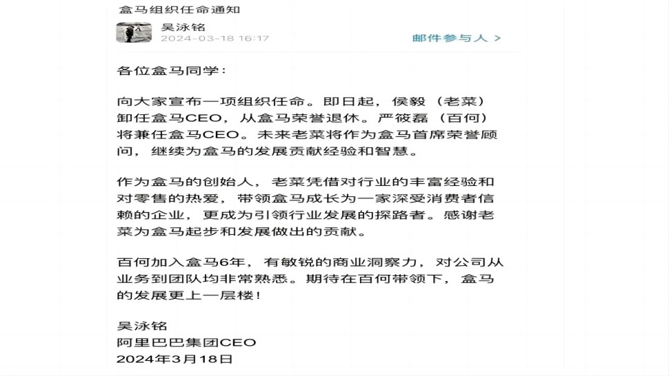 盒马CEO侯毅宣布退休 阿里梳理线下零售业务