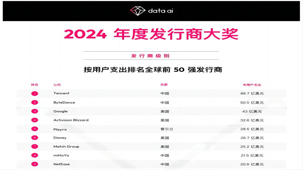 data.ai 2024 年度发行商 米哈游排名超过网易