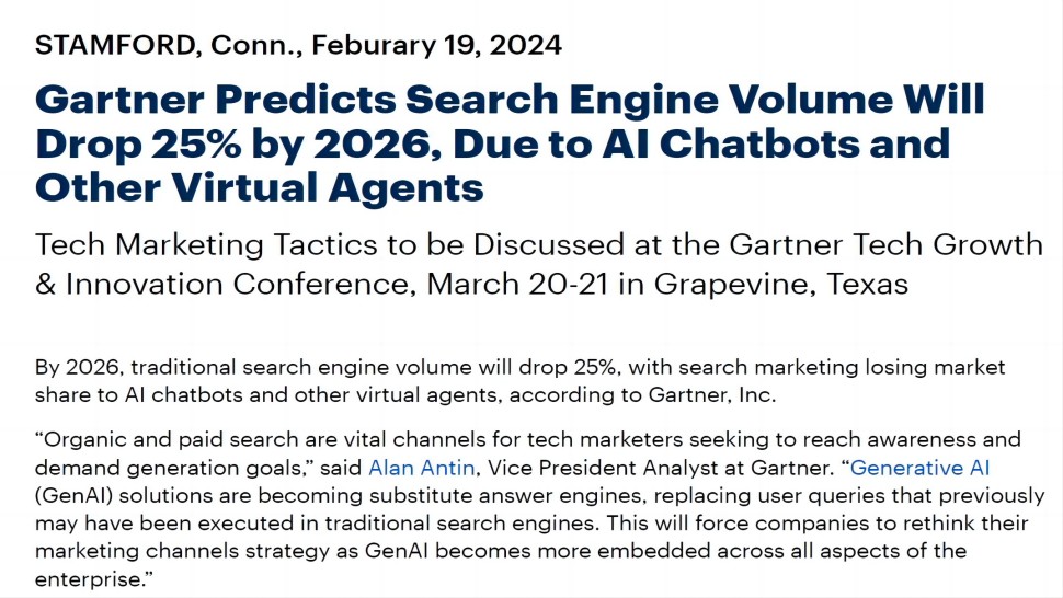 Gartner:到2026年GenAI 将使搜索引擎流量下降25%