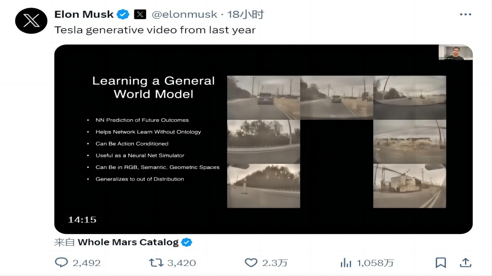 马斯克:特斯拉一年前就能 以精确的物理生成真实世界的视频